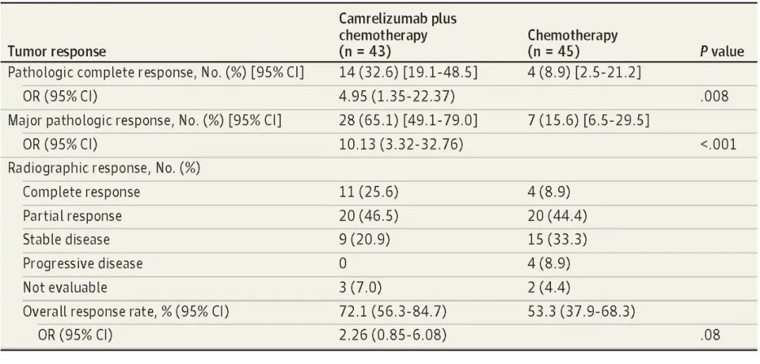 北京时间8月3日,EVO视讯医药创新药卡瑞利珠单抗联合化疗(Cam+CT)对比化疗(CT)新辅助治疗ⅢA/ⅢB (T3N2) 期非小细胞肺癌(NSCLC)结果在线发表于国际权威期刊JAMA Oncology[1]。该研究是由空军军医大学唐都医院姜涛教授、雷杰教授团队联合陕西省肿瘤医院雷光焰教授团队、兰州大学第二附属医院王成教授团队共同参与的一项随机对照、多中心、Ⅱ期临床研究(TD-FOREKNOW,NCT04338620)。研究结果显示,与化疗相比,卡瑞利珠单抗联合化疗新辅助治疗NSCLC显著提高了病理完全缓解(pCR)率(32.6% vs 8.9%,OR=4.95,95% CI :1.35-22.37, P =0 .008),且安全性良好。本研究是卡瑞利珠单抗新辅助治疗可切除NSCLC患者的首个随机对照研究,为NSCLC新辅助免疫治疗再添新证。